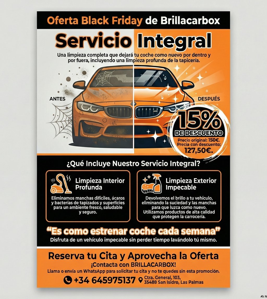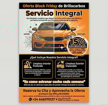 En Brillacarbox te ofrecemos una limpieza completa que dejará tu coche como nuevo, por dentro y por fuera. Nuestro Servicio Integral combina técnicas avanzadas y productos de alta calidad para garantizar un resultado impecable desde el primer minuto.
